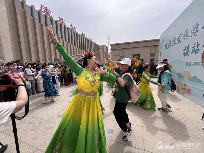 当日,自治区文化和旅游厅、新疆生产建设兵团文化和旅游局、中国铁路乌鲁木齐局集团有限公司、阿克苏地区行署、浙江省援疆前方指挥部共同举办接站仪式,让游客们一下火车就感受到“歌舞之乡”的魅力和新疆人民的热情。