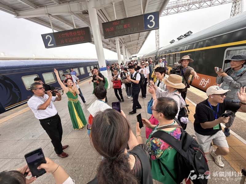 一下火车,游客们就被精彩的歌舞表演吸引。石榴云/新疆日报记者 张小宓摄