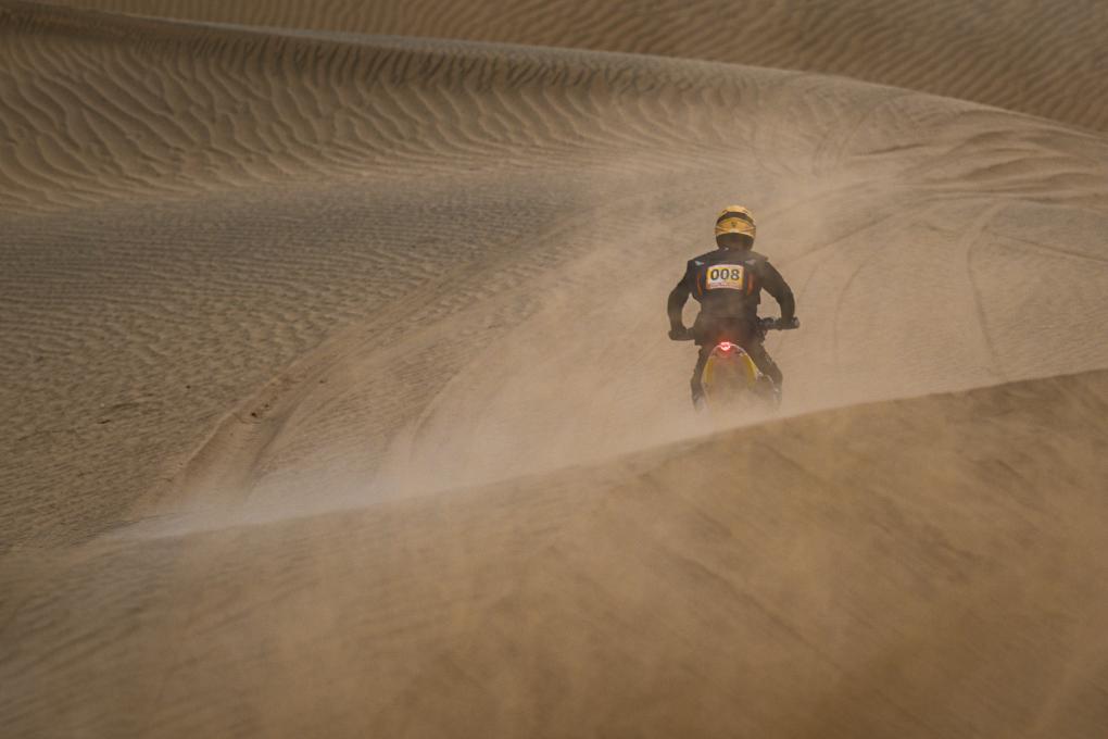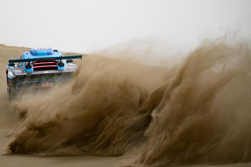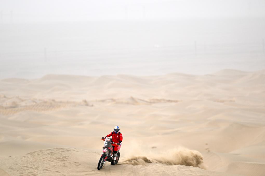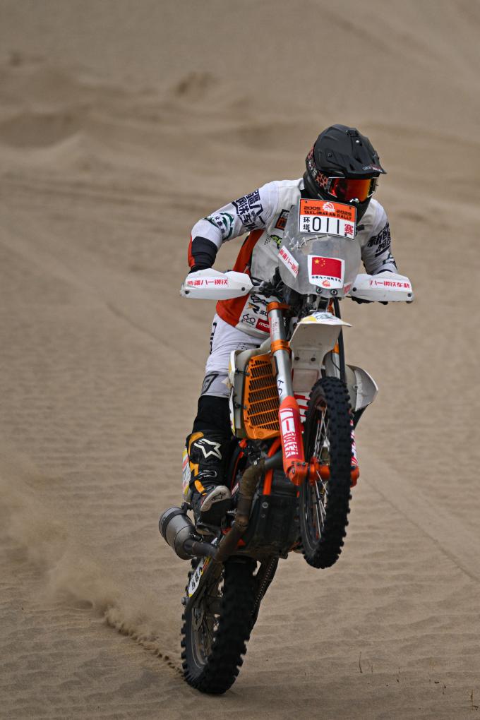 5月28日,久骑控车拉力车队车手彭杨在比赛中。