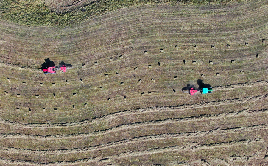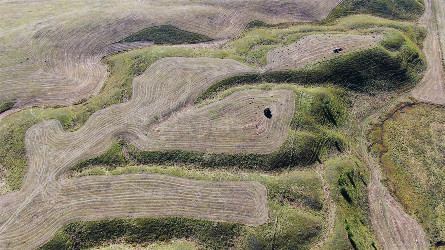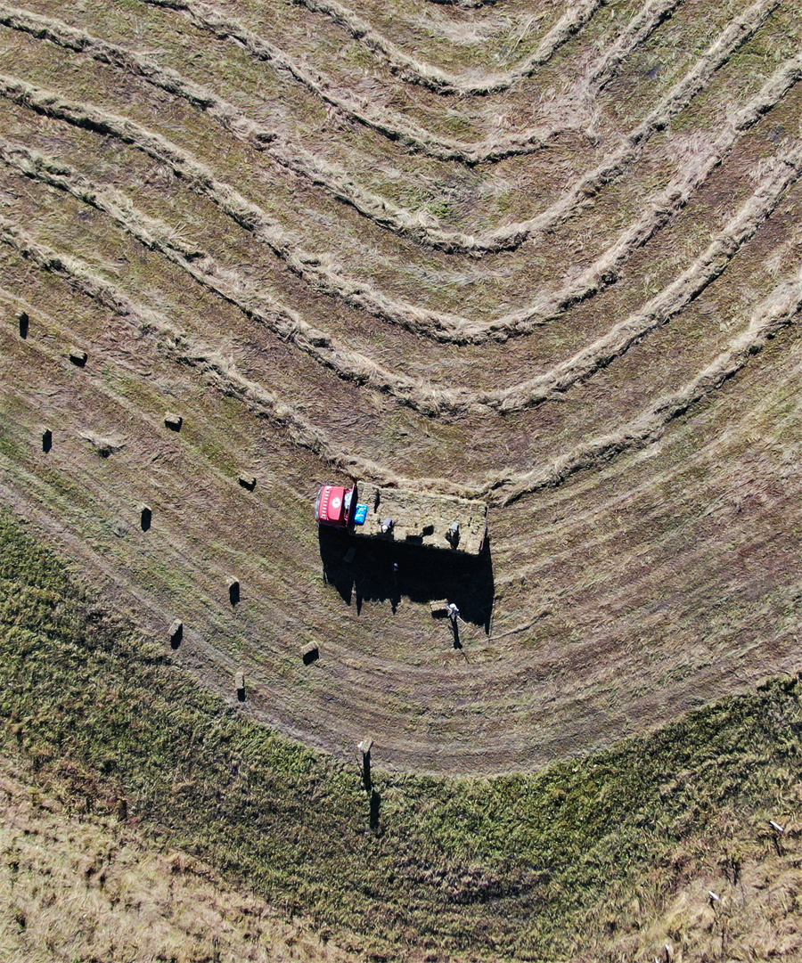 走进阿吾赞夏牧场,空气中满是青草的清新气息。伴随阵阵机械轰鸣声,一台台现代化打草机械正在紧张作业。高空俯瞰,机械作业有如画家的画笔,在草原上画出深浅交错的纹路,一捆捆方形的牧草犹如散落在草原上“画作”里最鲜明的点缀。这一切把盛夏草原的生机,酿成可收藏的丰收底色。