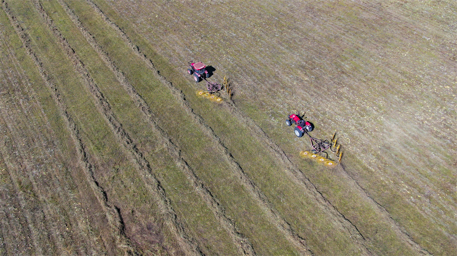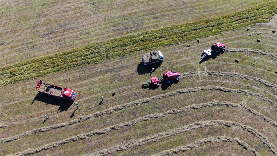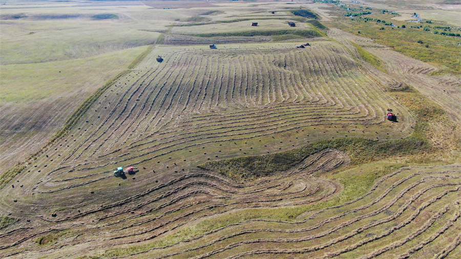 8月26日,各类机械相互配合,进行牧草收割作业。