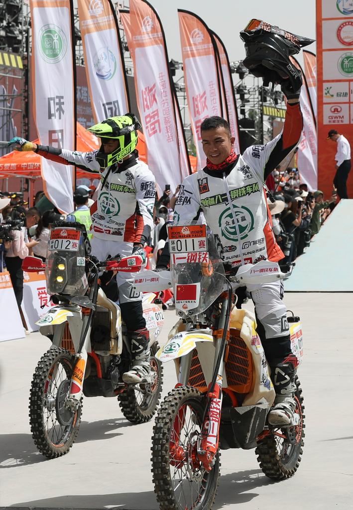 5月20日,宁夏南方商城雄鹰赛车队车手宋昆、领航员付昕明在发车仪式上。
