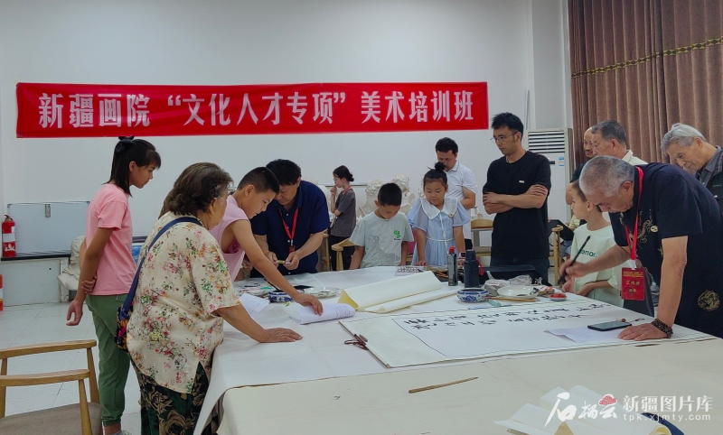 “老师,能再示范一次篆书笔法吗?”在柯坪县书法培训现场,书法爱好者们围着乌鲁木齐市书法家协会副主席程配建不愿散去。“石榴籽”文艺小分队书画家们采用“培训 创作”模式,在阿克苏各地开设书画培训专项课堂,为众多基层文化工作者与爱好者们传授技法,将“送文化”与“种文化”相结合。