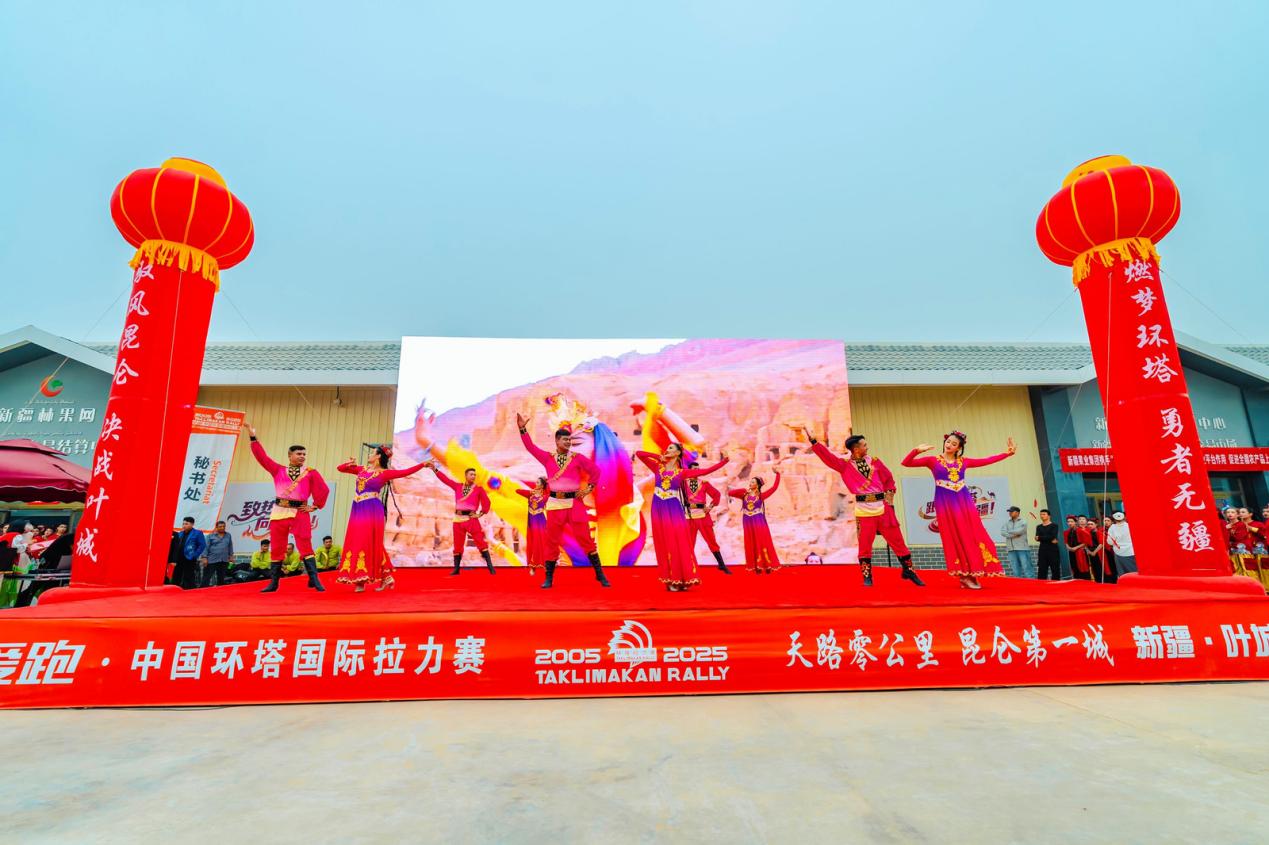 在环塔拉力赛结束了前七个赛段过后,赛事移师新疆喀什地区叶城县,这也是环塔拉力赛首次将赛段设置在这座丝路重镇上。叶城,这座位于新疆西南的丝路古城,南依巍峨昆仑,北望广袤沙海,不仅拥有丰富的地貌资源与深厚的文化底蕴,更以其独特地理位置——“219国道零公里起点”而闻名。本次叶城大营的迎宾晚会,既是对远道而来环塔车手们的热情接待,也是叶城对全国观众展示自我风采的重要窗口。