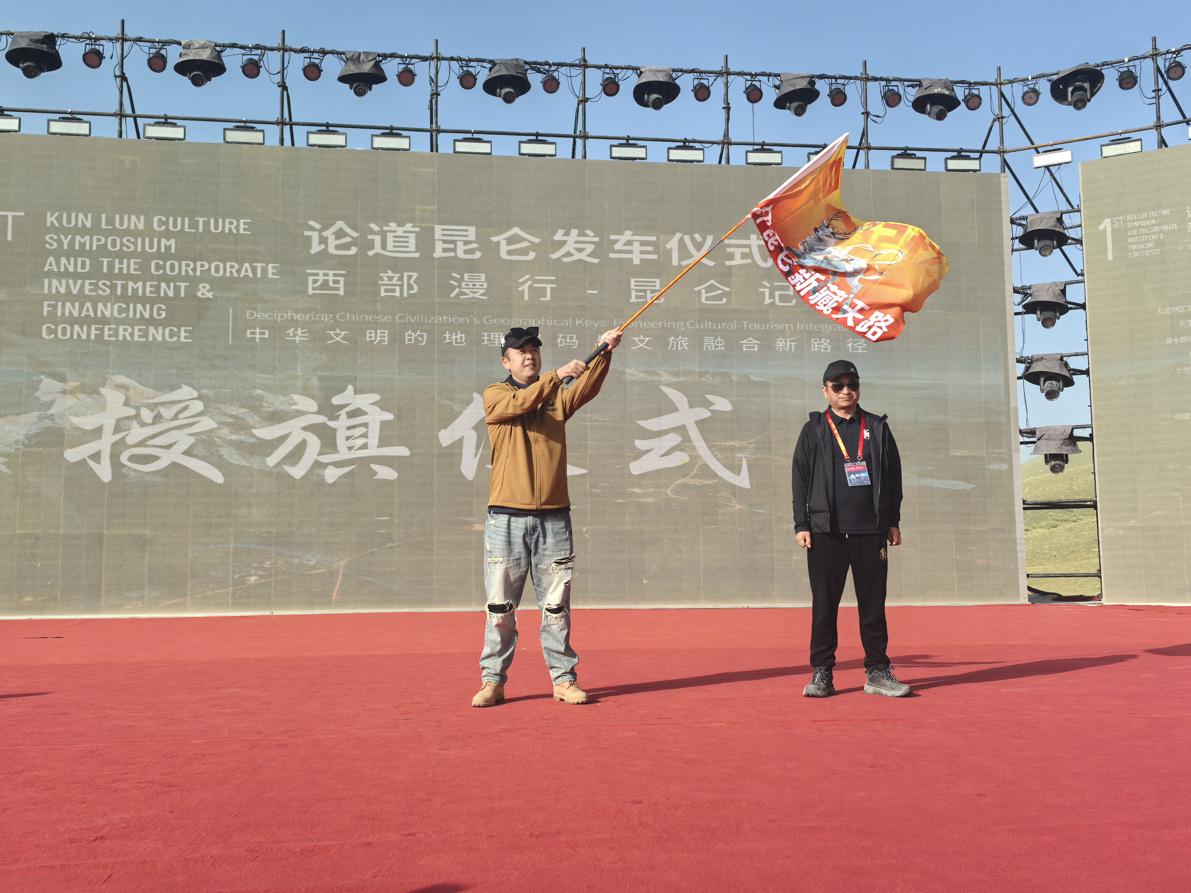 新疆维吾尔自治区旅游景区(点)协会秘书长李磊为自驾车队授旗。