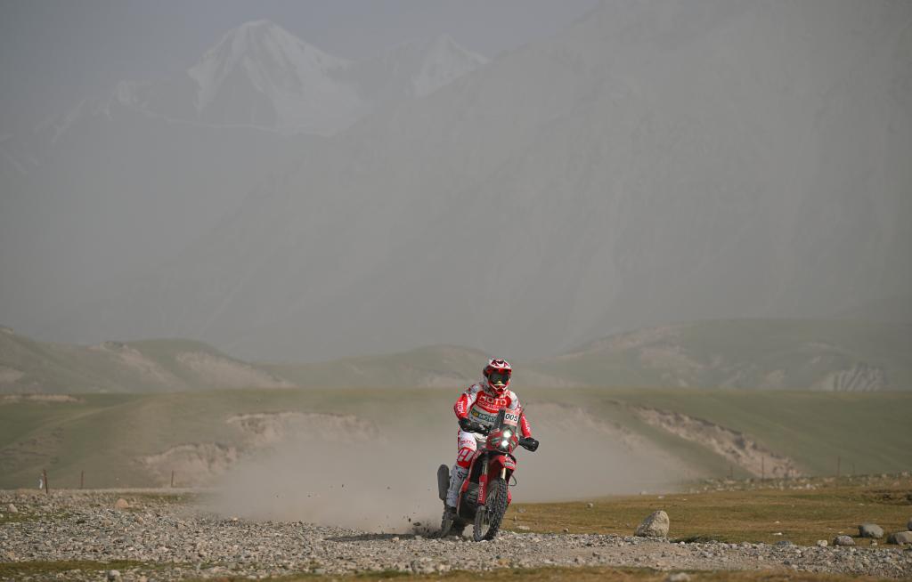 5月21日,红驼机车厂队一队车手方响量在第一赛段比赛中穿越一处高山赛段,身后的雪山隐约可见。