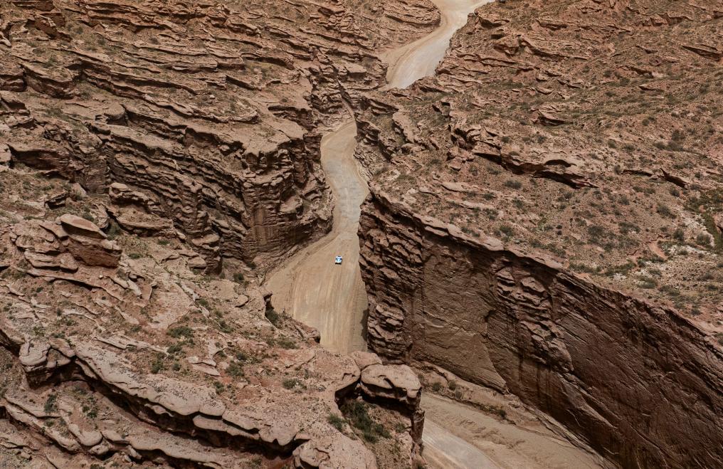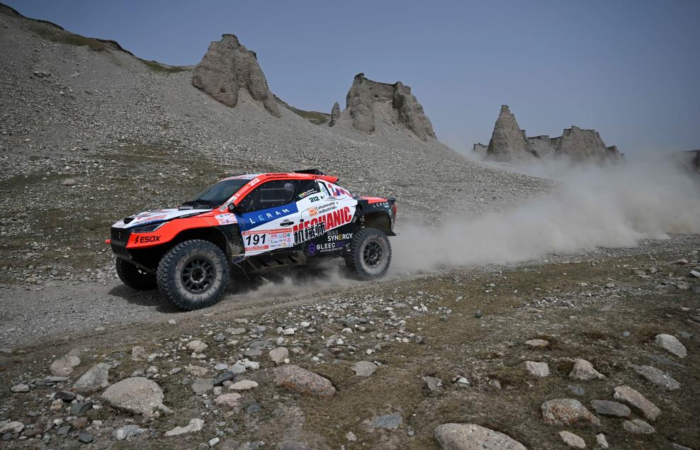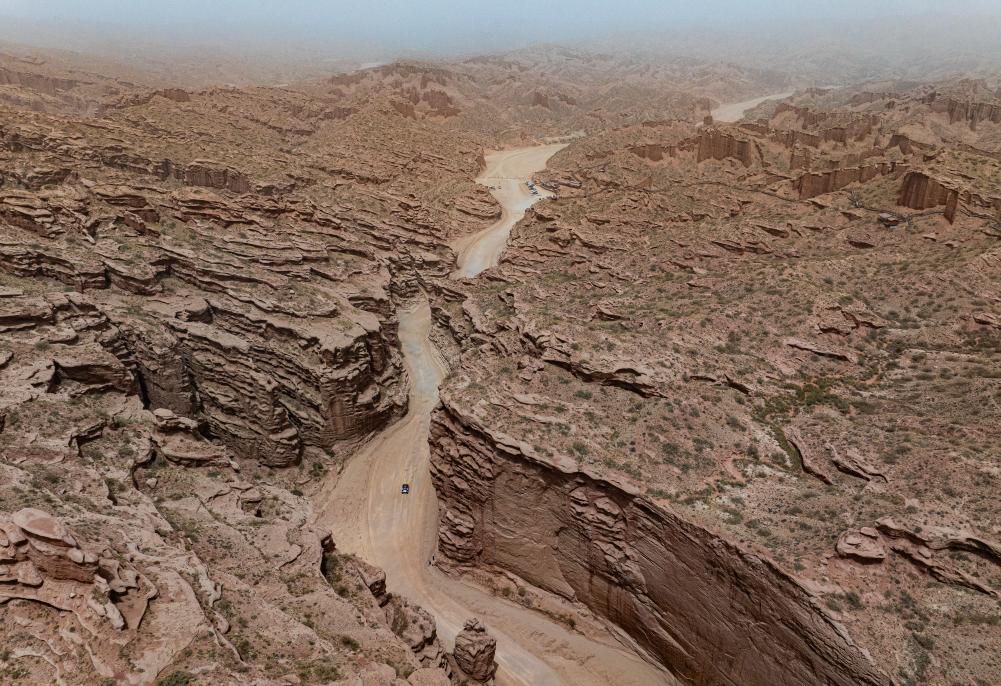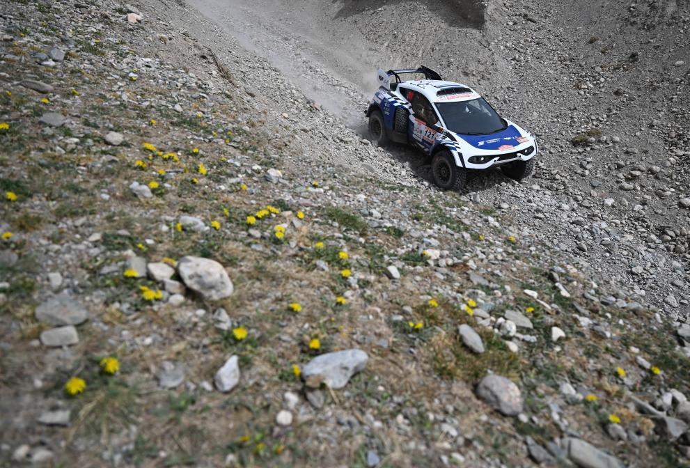 5月21日,纵横g700车队车手那音太、领航员敖布勒格驾驶赛车在第一赛段比赛中(无人机照片)。